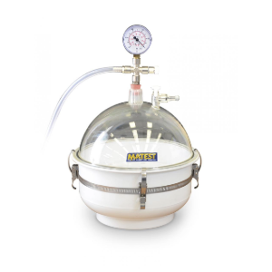 Servi’s product, the pycnometer, is supplied in stainless steel with a glass lid and metal clamp.